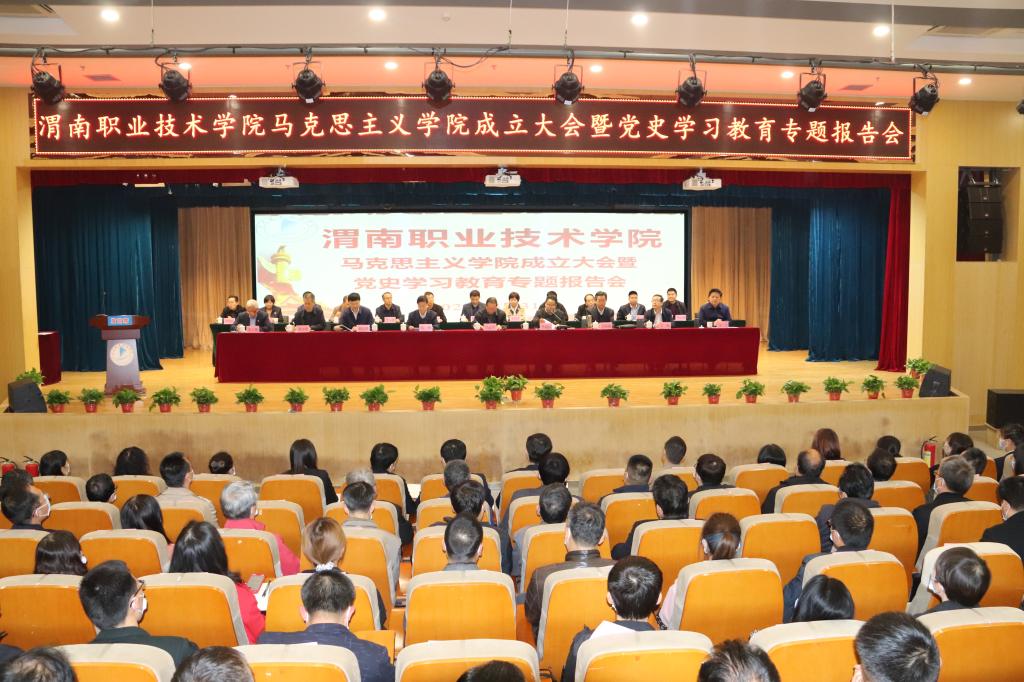 3月31日下午,bat365在新校区图书楼报告厅举行bat365中文官方网站成立大会暨党史学习教育专题报告会。陕西省延安精神研究会副会长冯志军,渭南技师学院院长曲志勇,渭南市委党校常务副校长王恒,渭南市委讲师团团长杨永宏及兄弟院校bat365中文官方网站院长出席会议。校外专家学者、爱国主义教育和红色教育研学基地负责人,学校领导班子成员、副科级以上干部、bat365中文官方网站全体教职工、部分学生代表参加。大会分两个阶段。