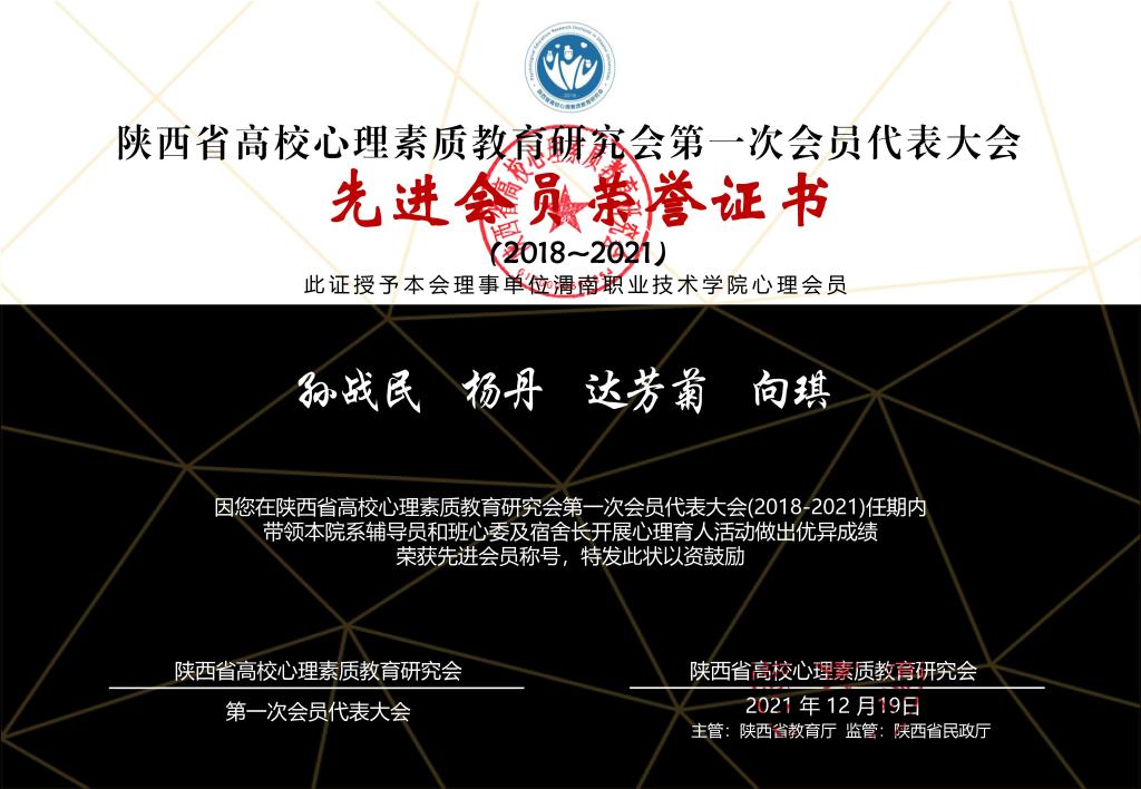 近日,省高校心理素质教育研究会对理事单位心理育人工作成就进行了表彰,bat365达芳菊教授、向琪副教授两位老师荣获“先进会员”荣誉称号。向琪老师还荣获“2021年度陕西省高校十佳心理师提名”荣誉称号。