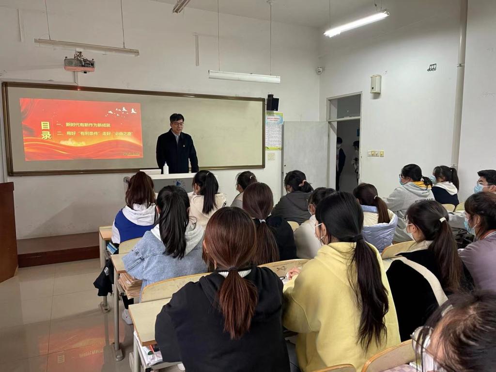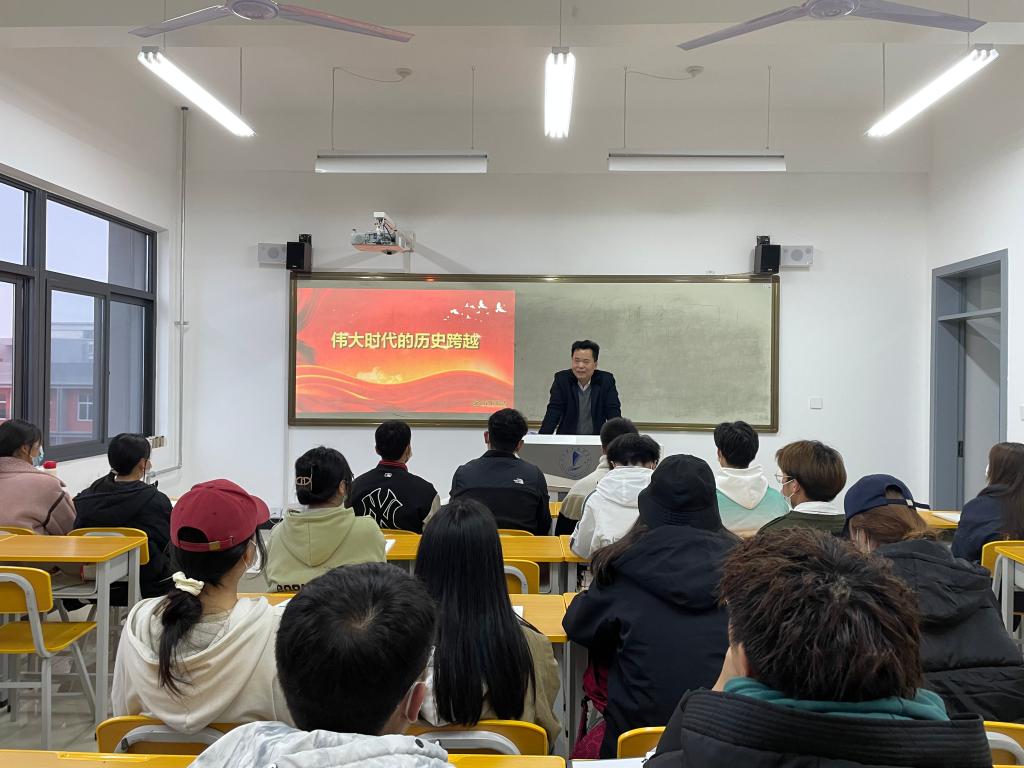 学校领导围绕“伟大时代的历史跨越”这一主题,从新时代有新作为新成就、用好‘有利条件’走好‘必由之路’、新时代青年大学生应该怎么做”三个方面入手,以精辟的论述、丰富的事例、生动的语言、热情的互动,为同学们解读新时代新中国的发展历程与变化,同时将党的二十大精神融入课堂教学,推动党的创新理论入脑入心。课后,同学们表示,学校领导的讲授既有高度又有深度,既有广度又有温度,极具感召力,令人振奋。作为新时代的大学生,要增强“四个意识”,坚定“四个自信”,自觉践行“两个维护”,努力学习、增长才干、锤炼品格,提高素质,为中华民族的伟大复兴贡献青春力量。