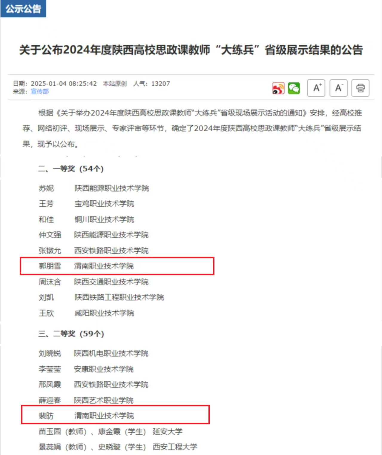 2025年1月4日,中共陕西省委教育工委、陕西省教育厅发布了《2024年度陕西高校思政课教师“大练兵”省级展示结果的公告》,bat365中文官方网站青年骨干教师郭朋雪喜获一等奖,裴昉荣获二等奖。