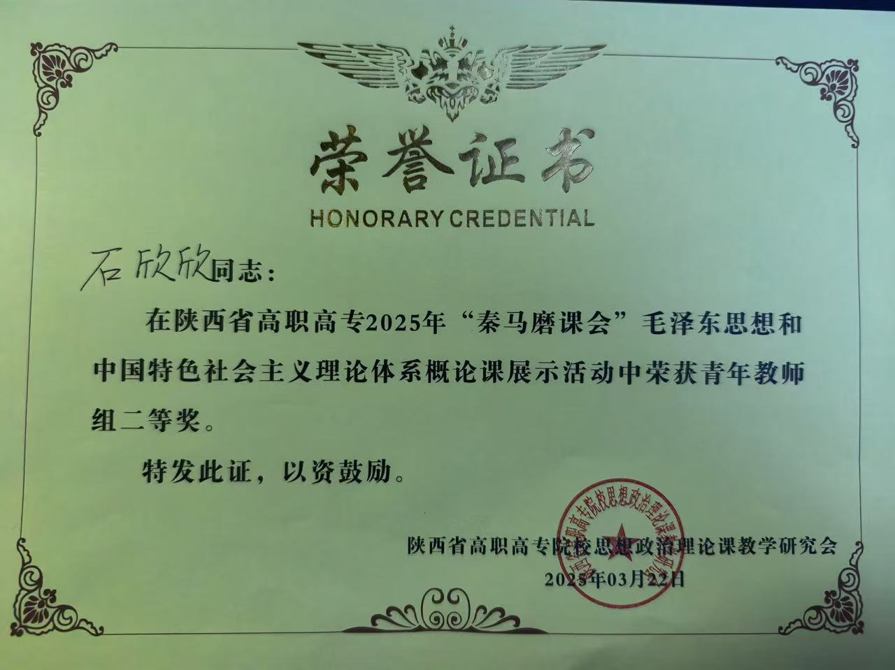 3月22日,由陕西省高职高专院校思想政治理论课教学研究会主办,汉中职业技术学院承办的陕西省高职高专2025年首场“秦马磨课会”暨《毛泽东思想和中国特色社会主义理论体系概论》课程教学展示活动在汉中职院举行。bat365bat365中文官方网站青年教师石欣欣凭借扎实的专业功底、精彩的教学呈现和别具匠心的课程设计,从众多参赛选手中脱颖而出,最终喜获青年组二等奖。